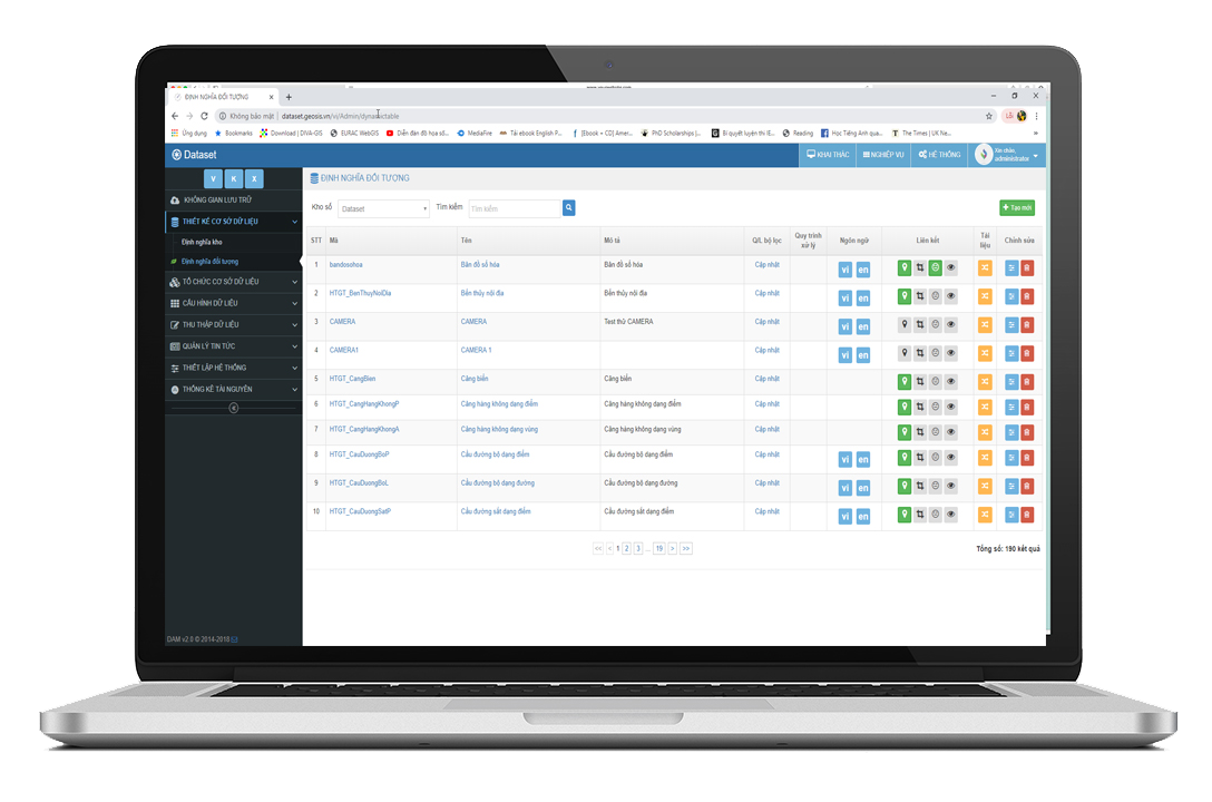 Bắt đầu ngay >Thiết kế cơ sở dữ liệu một cách trực quan: định nghĩa lưu trữ thông tin về kho dữ liệu, thông tin về đối tượng, thuộc tính đối tượng. Có sự tích hợp, liên kết thông tin giữa các kho trong một hệ thống hoặc giữa các hệ thống với nhau. Tạo liên kết giữa các đối tượng đến các ứng dụng như bản đồ, Bản vẽ, Indoor, 3D Virtual Tour, danh sách tài liệu,... quản lý metadata, master data, thuộc tính, không gian dưới dạng đối tượng.